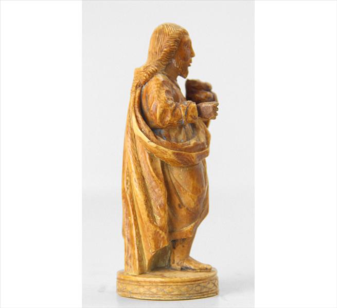 SÃO JOSÉ DE BOTAS, Imagem de marfim de Goa finamente esculpido. Alt. 11 x 05 x 05cm. Séc. XVIII (falta cabeça do Menino / mão e Menino Jesus de madeira adaptados)