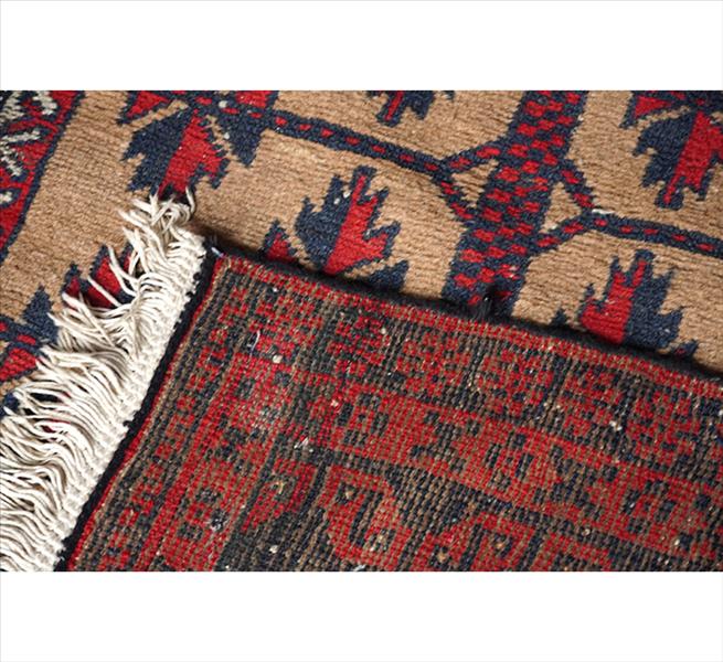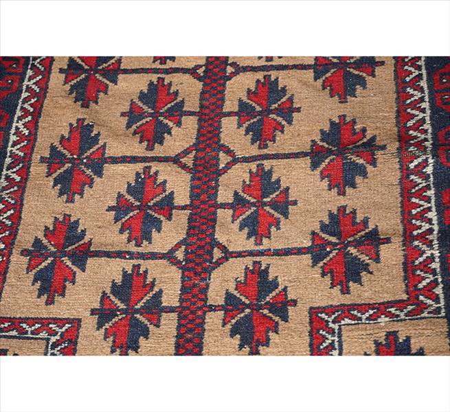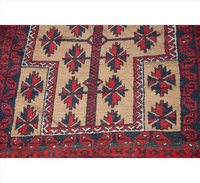 Tapete Balouch, decoração com possível estilização da árvore da vida composta por rosetas geométricas dispostas em eixo vertical, campo com tonalidade predominante bege, borda com faixa principal em vermelho e ornamentos florais estilizados em azul marinho, 150 x 97 cm = 1,45 m², meados do século XX. (com pontos rape)
