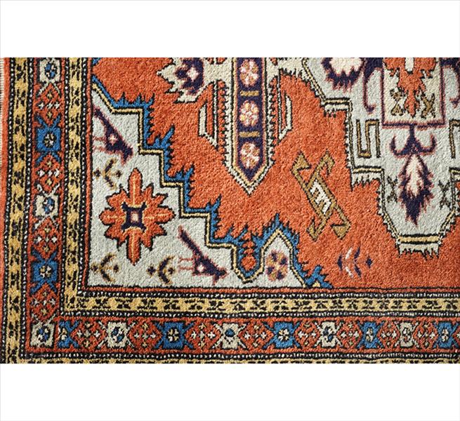 Tapete caucasiano, decoração geométrica com medalhão central e elementos estilizados angulares, campo com tonalidade predominante laranja queimado, borda com faixas sucessivas e motivos florais em azul e marfim, 95 x 74 cm = 0,70 m²