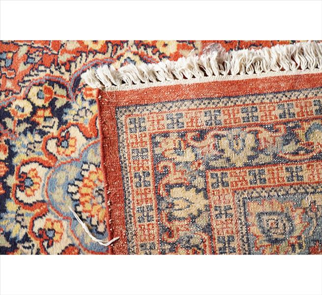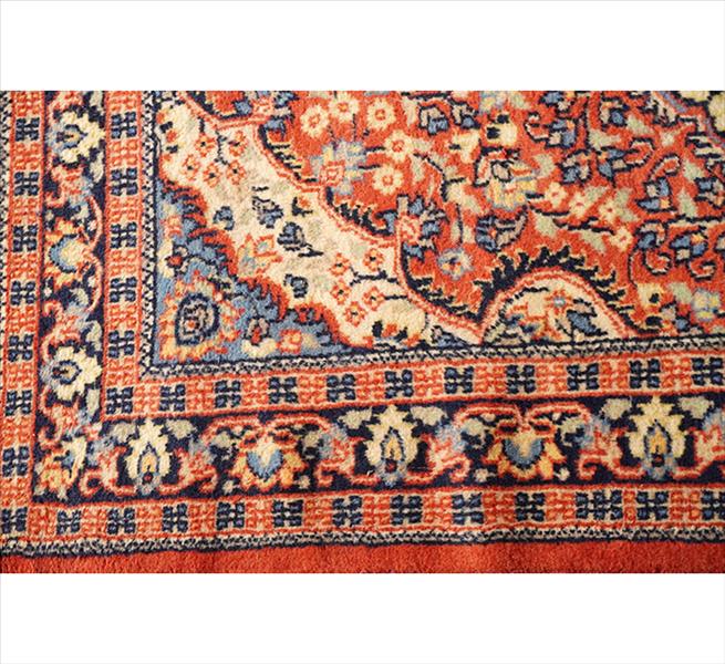 Tapete iraniano Tabriz, decoração medalhão central floral com campo preenchido por arabescos e ramagens, campo com tonalidade predominante vermelho alaranjado, borda tripla com faixa principal azul escuro decorada com florões estilizados, 194 x 122 cm = 2,36 m²(precisa restauro / precisa refazer franja)