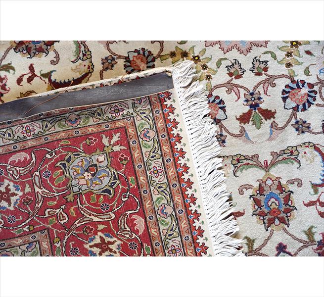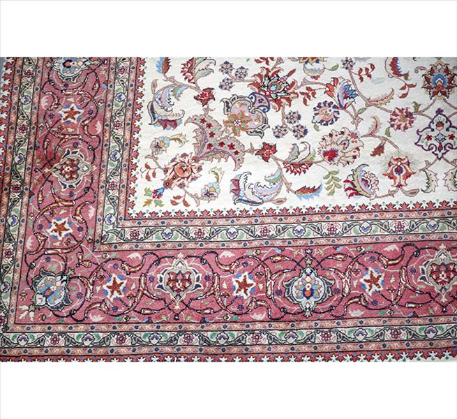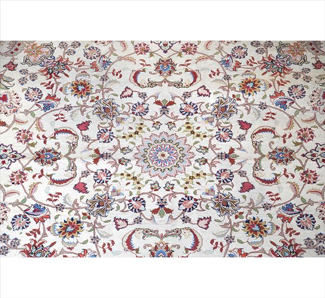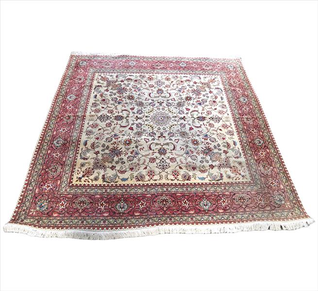 Tapete Isfahan, decoração com medalhão central floral radial e composição simétrica de ramos florais entre pássaros estilizados, campo com tonalidade predominante marfim, borda larga vermelha com cartuchos e flores palmetadas, 202 x 208 cm = 4,20 m²
