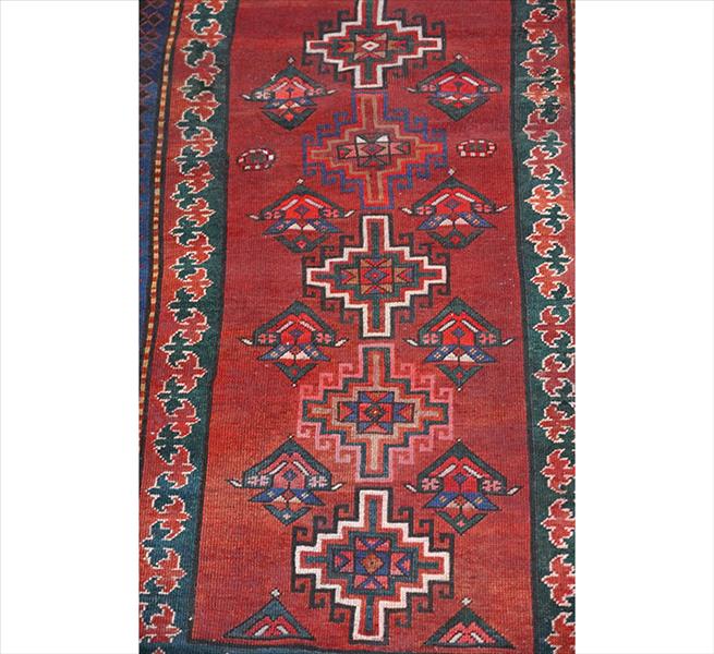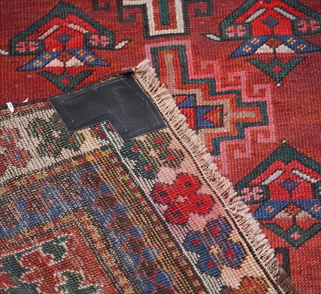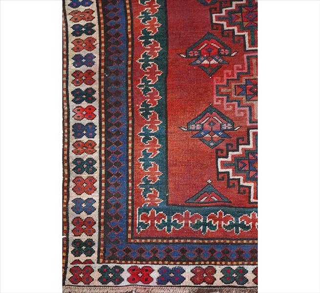 Tapete Shirvan Karagashli caucasiano, decoração geométrica com medalhões escalonados e pequenos motivos florais, campo com tonalidade predominante vermelho-telha, borda com faixas alternadas em padrões florais e geométricos, 180 x 102 cm = 1,84 m²(apresenta manchas)