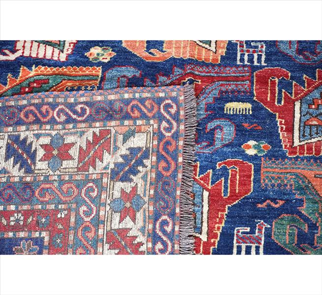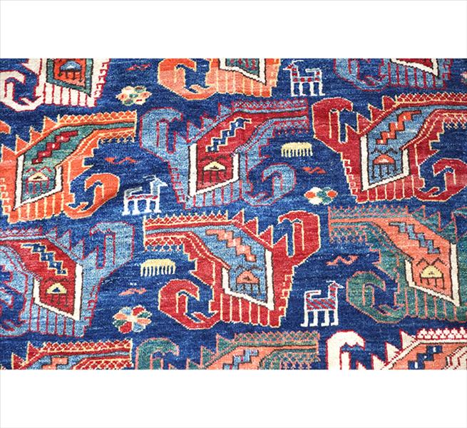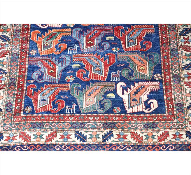 Tapete tribal caucasiano, possivelmente da região de Quba/Shirvan, decoração com motivos zoomorfos estilizados e elementos geométricos repetidos, campo com tonalidade predominante azul, borda em múltiplas faixas com elementos geométricos e ganchos estilizados, 200 x 170 cm = 3,40 m²