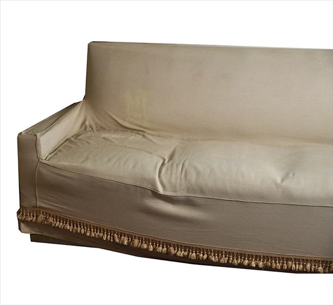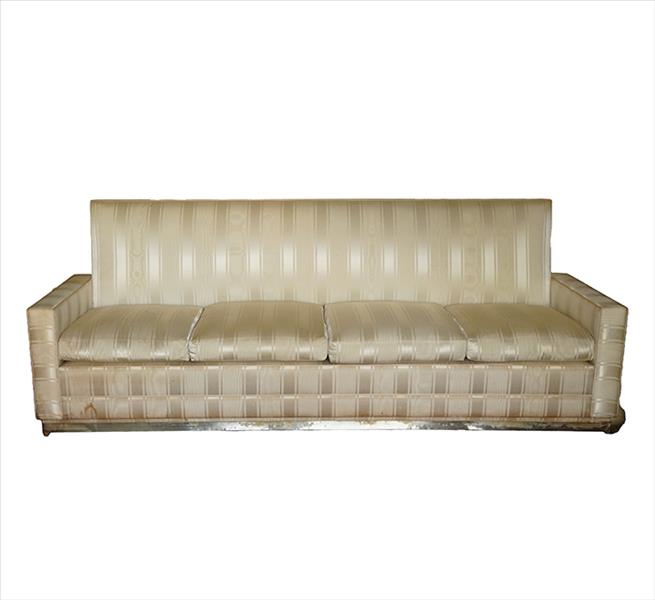 Sofá 05 lugares com estrutura de madeira, forração de tecido fino com cetin, base revestida de folha cromada, acompanha capa de tecido com franjas. Alt. 88 x 295 x 78cm. Brasil, década 60/70 (capa com rasgos)
