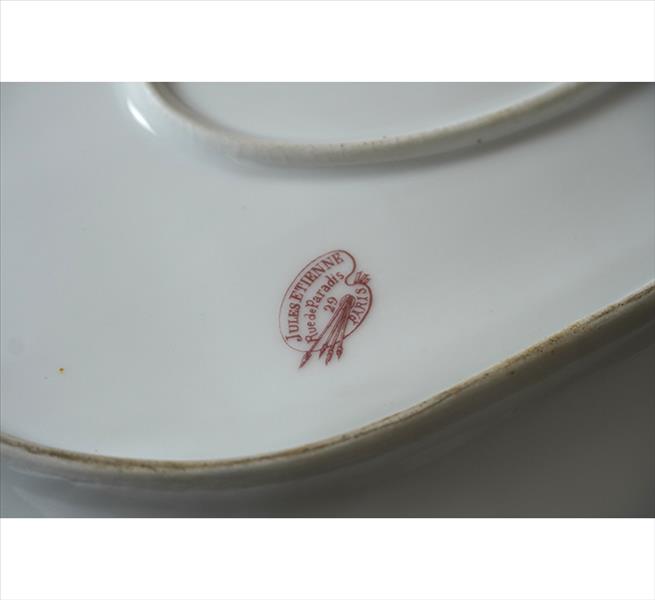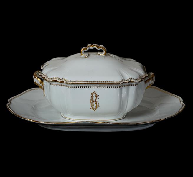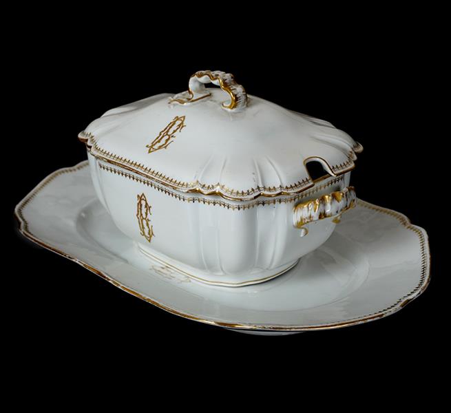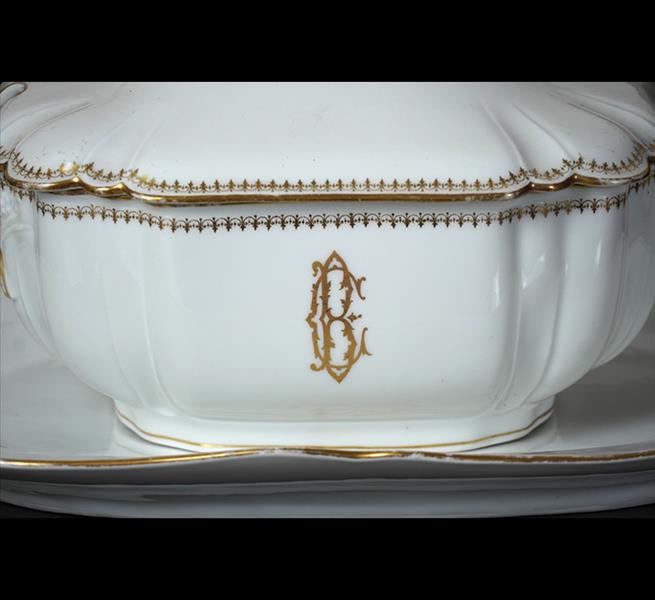 JULES ETIENNE, Sopeira de porcelana dito Vieux-Paris, ornamentada com douração, contém monograma de iniciais, marca da manufatura sob a base. Alt. 21 x 45 x 29cm (total). França, séc. XIX (com fio de cabelo na sopeira)