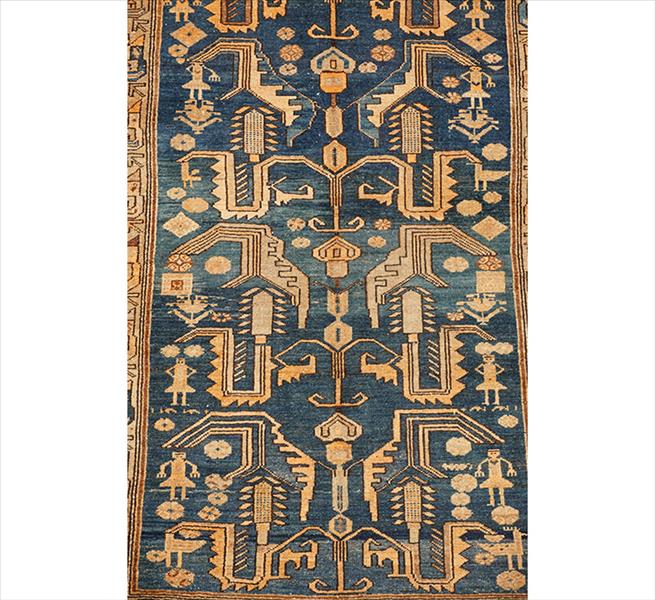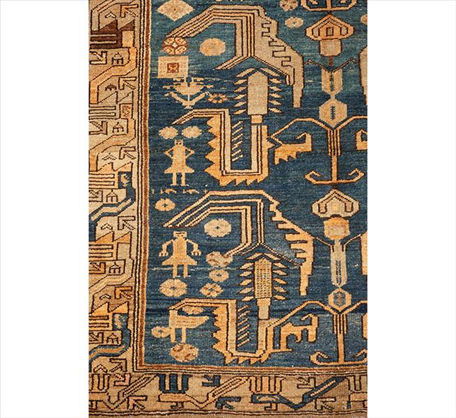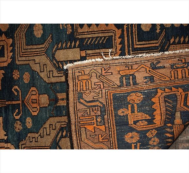 Tapete caucasiano Karabagh, decoração geométrica com variantes tardias do motivo dragão estilizado em disposição axial simétrica, apresentando elementos zoomórficos angulares, figuras humanas esquemáticas e ganchos recortados característicos da região de Karabagh; campo em tonalidade predominante azul-escuro, com motivos principais em bege, castanho e azul claro; borda tripla com faixa principal geométrica do tipo running dog reinterpretado, acompanhada de ornamentos angulares menores; 186 x 127 cm = 2,36 m²; circa 1900–1920. (desgaste de uso compatível com a idade)