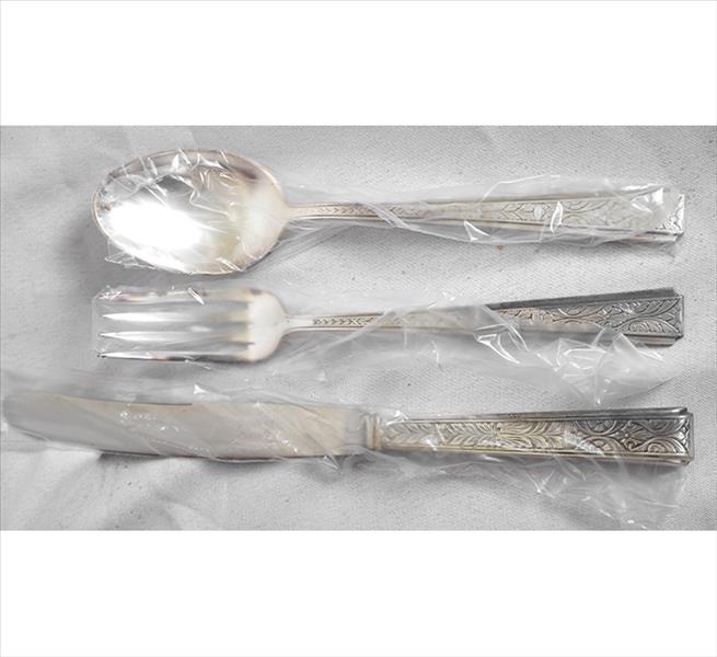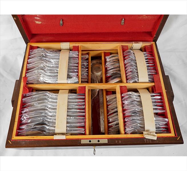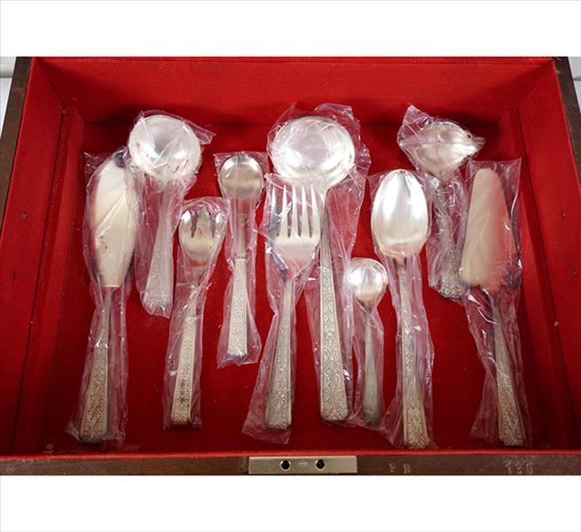 FRACALANZA, Faqueiro sem uso na embalagem original, metal espessurado à prata na caixa original, completo para 12 pessoas, contendo serviço de peixe, sendo 12 facas jantar, 12 garfos, 12 colheres, 12 f. sobremesa, 12g. bs., 12c. sb., 12 g. peixe, 12 g/ peixe e 10 peças de servir, total 106 peças. 14 x 54 x 40cm (caixa)