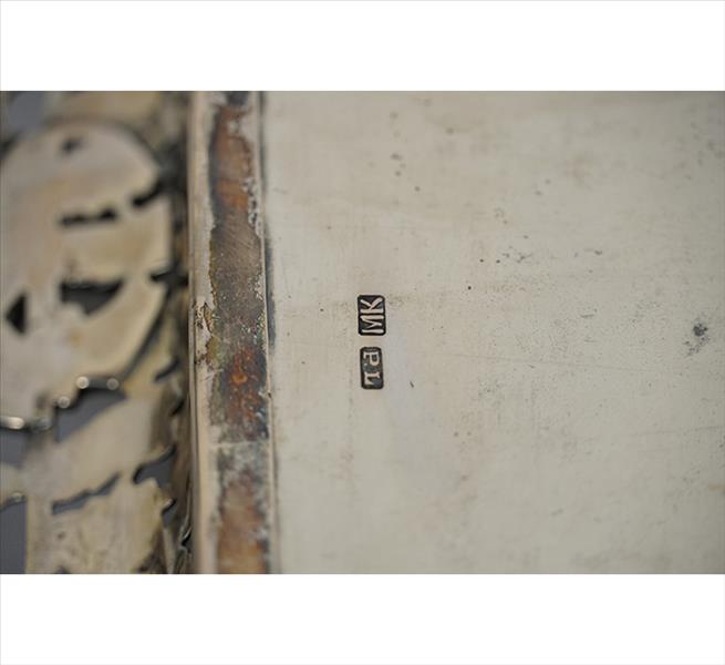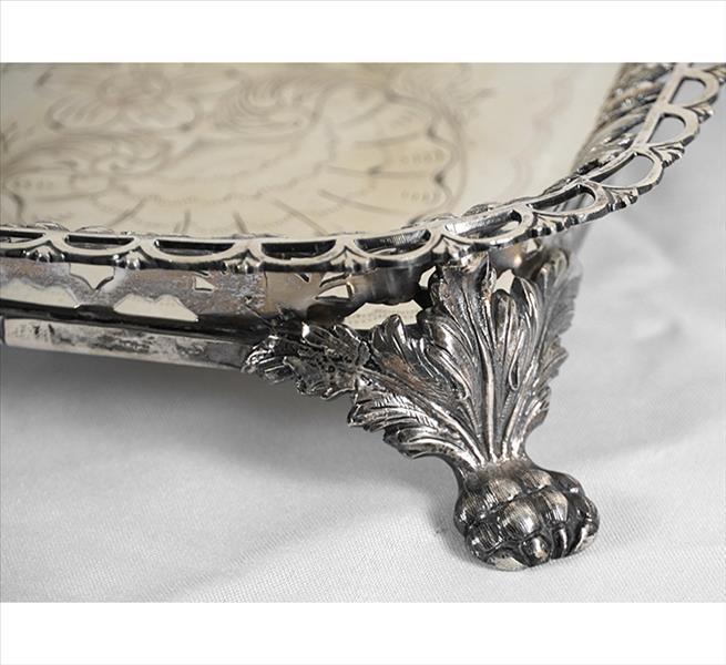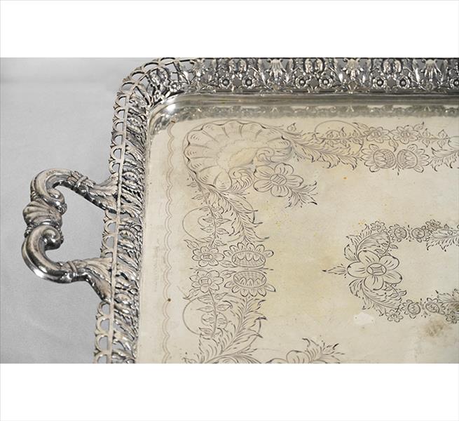 Tabuleiro de prata-de-lei, contraste do prateiro P.L, M.K, ricamente ornamentada com motivos florais e guirlandas cinzeladas, galeria fenestrada, pegas laterais com rocalhas estilizadas. Alt. 08 x 75 x 50cm. Início séc. XX