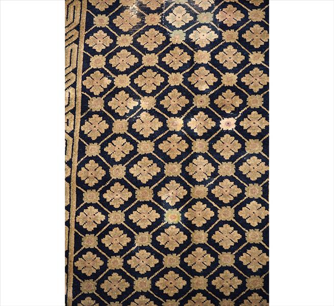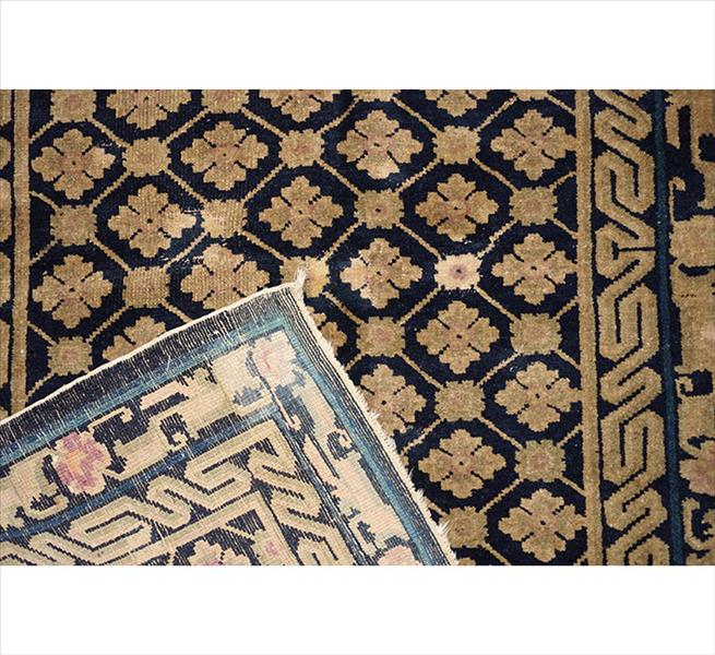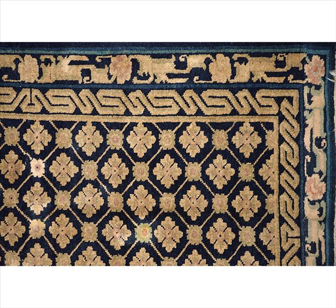 Tapete chinês Ningxia, decoração em repetição geométrica de florões estilizados dispostos em malha losangular contínua sobre campo em tonalidade predominante azul-escuro, com motivos principais em bege e acentos rosados; borda tripla com faixa principal em padrão meandro sinuoso acompanhado de ornamentos florais estilizados em azul e bege; 163 x 101 cm = 1,64 m²; final do século XIX – início do século XX. (com pontos rape e desgaste localizado no campo)