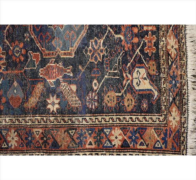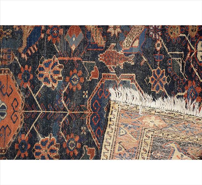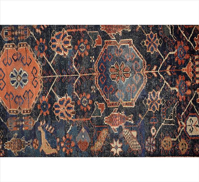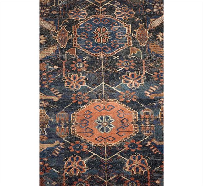 Tapete caucasiano Karabagh, decorado com dois grandes medalhões octogonais alinhados no eixo central, preenchidos por florões estilizados em azul-marinho, terracota e bege, campo em azul-escuro com variados motivos zoomórficos, incluindo peixes, pássaros, quadrúpedes e elementos florais geométricos, borda tripla com faixa principal em fundo marfim ornada por motivos triangulares e estrelas policromáticas, 185 x 107 cm = 1,98 m². Séc. XIX/XX (rape)