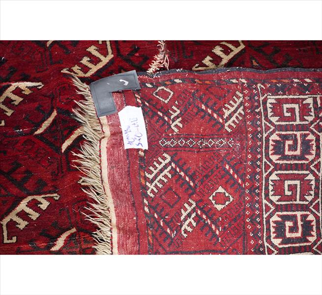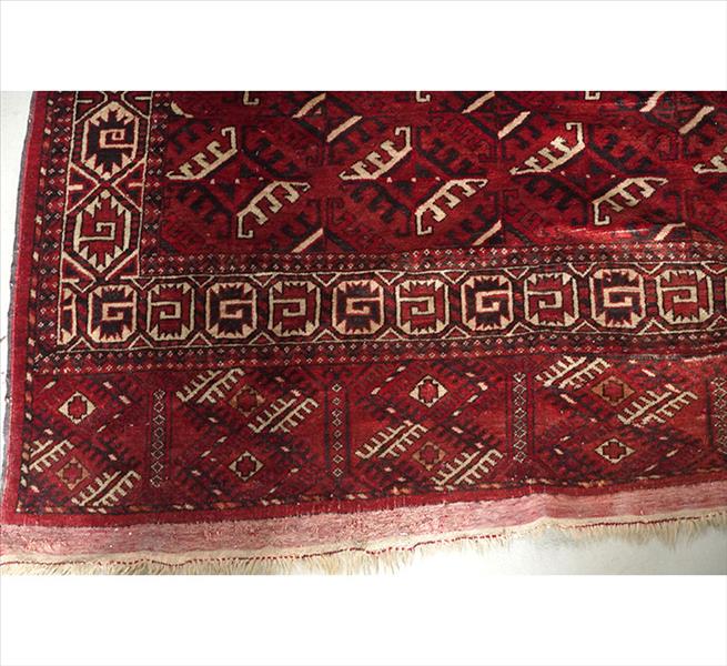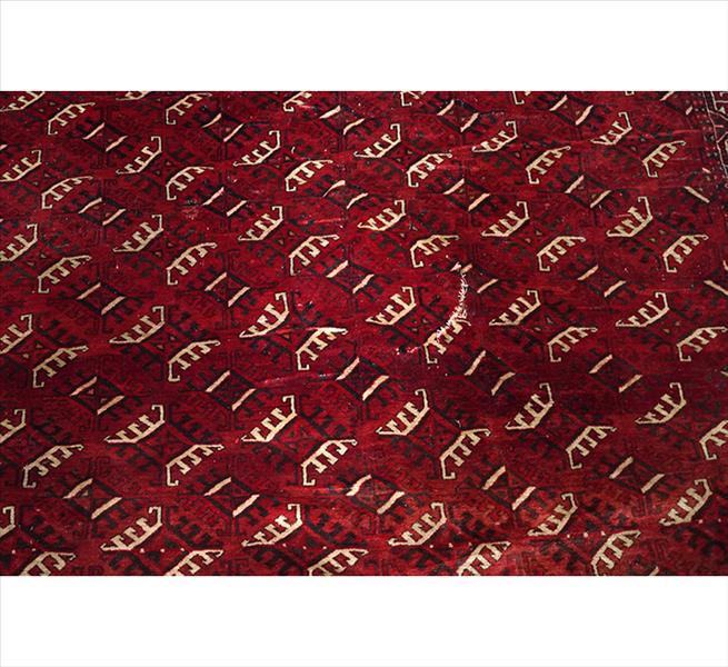 Tapete turcomano Tekke, Ásia Central, campo vermelho escuro com repetição de motivos gul octogonais alinhados, bordas com faixa principal geométrica e faixa elem inferior com losangos cruzados, composição tradicional de tribo Tekke em lã sobre lã, 317 x 225 cm = 7,13 m², início do século XX. (com desgaste no campo, furo visível e franjas ausentes)