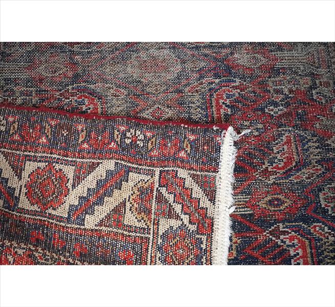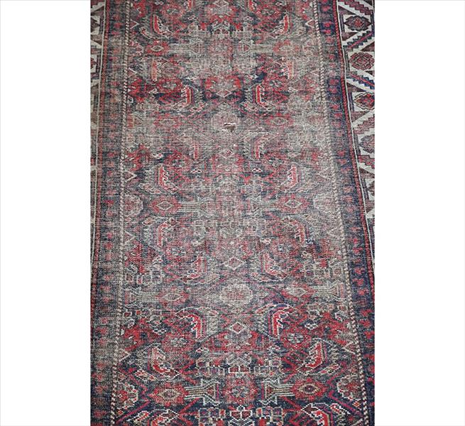 Tapete tribal Baluch, decoração axial com repetição de medalhões romboidais estilizados em eixo vertical, com preenchimento geométrico simétrico em tonalidades contrastantes, campo com tonalidade predominante azul-marinho escuro, borda tripla com faixa principal em vermelho ferrugem e ornamentos em ziguezague com estrelas geométricas, 237 x 104 cm = 2,46 m², meados do século XX. (rape)