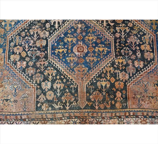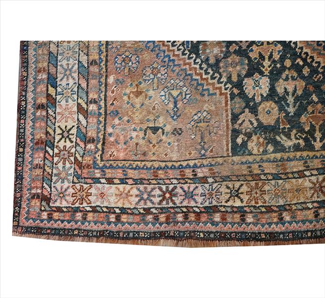 Tapete persa Shiraz com composição central em colunata vertical de medalhões hexagonais escalonados sobre campo negro com elementos florais dispersos em arranjo livre, ladeado por quatro cantoneiras em fundo rosado com arabescos arbóreos e serrilhado interno destacado, motivos florais estilizados e pequenos buquês povoam o campo escuro em alternância cromática com os medalhões em azul, marfim e ferrugem, borda principal com faixa de estrelas multicoloridas sobre fundo bege, ladeada por guardas menores com folhagens diagonais, fatura fina e desenho levemente assimétrico, lã macia com abrasão natural e tons suavizados pelo tempo, 232 x 176 cm = 4,08 m², oeste do Irã, c. 1920 (rape / precisa refazer cordão)