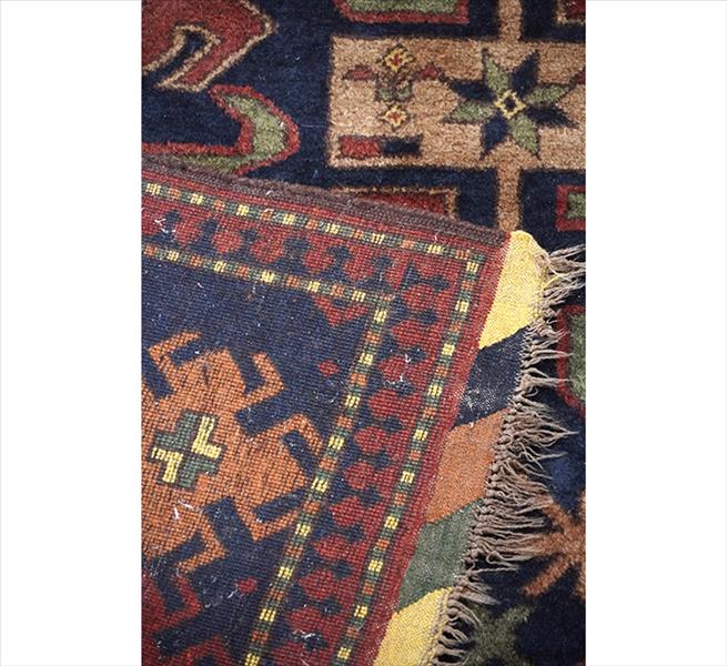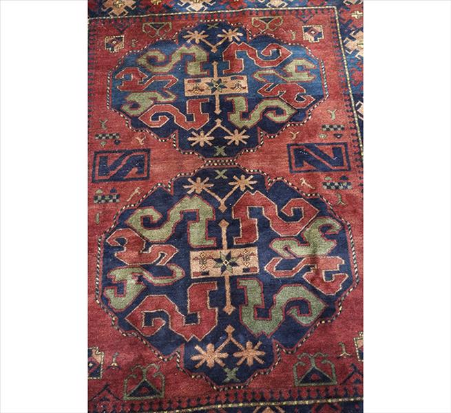Tapete caucasiano tipo Kazak Karachopf, decoração com dois grandes medalhões octogonais interligados, preenchidos por ganchos estilizados, cruzes duplas e rosetas de oito pontas, campo em tom vermelho ferrugem, medalhões em azul marinho e verde musgo, borda tripla geométrica com cruzes estilizadas e meandros, 295 x 200cm = 5,90m², circa 1920