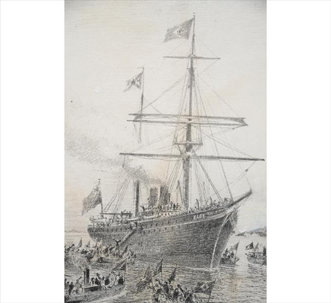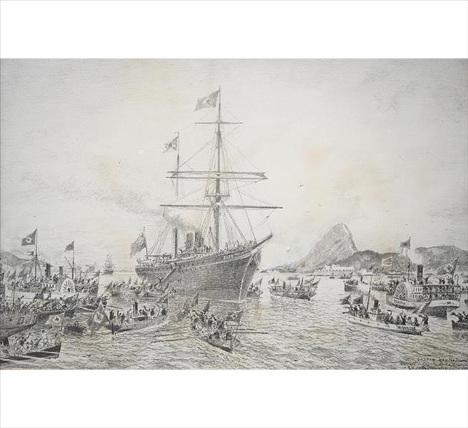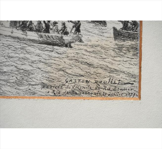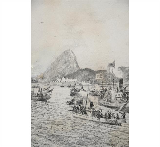 GASTON ROULLET, Barco a Vela com Vista do Rio de Janeiro, Desenho à Grafite, ACID, 21 x 30cm (m.i). Datado 1879