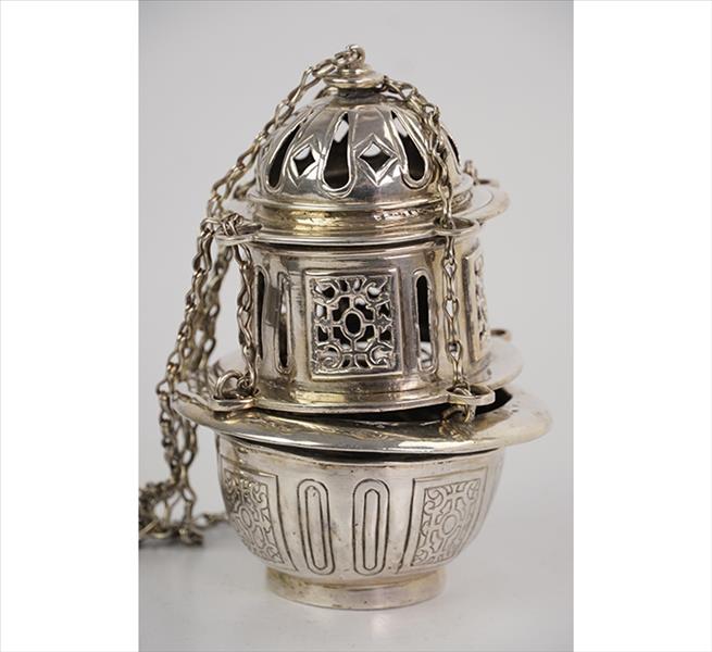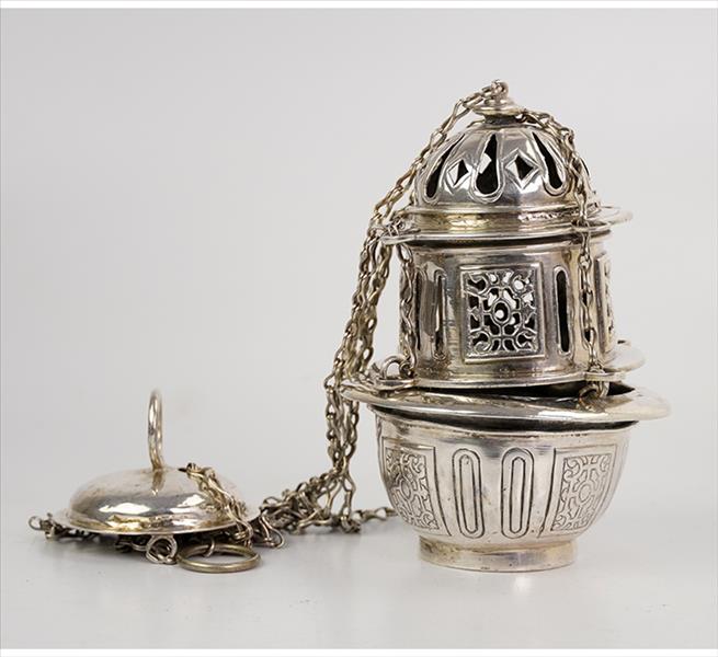 Turíbulo de prata-de-lei ricamente decorado com fenestras, caneluras e ramagens estilizadas. Alt 66 x 12cm (com corrente esticada) e 17 x 12cm (parte inferior). Brasil, séc. XVIII . ( 815g )