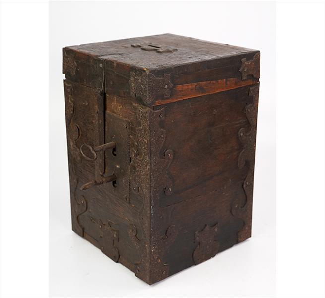 Cofre ou esmoleira de madeira nobre, forma reta, ornamentado com aplicações de ferro em forma de volutas, ferragens de época. Alt. 34 x 23 x 23cm. Brasil, séc. XVIII