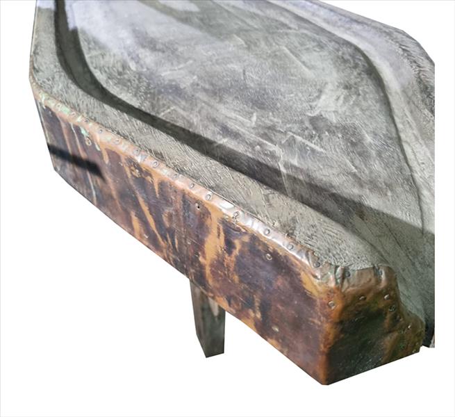 Grande mesa queijeira de madeira nobre maciça, sendo as pernas retas com travas de encaixe, laterais ornamentadas com placas de cobre repuxadas à mão. Alt. 89 x 251 x 43cm. Brasil, séc. XIX