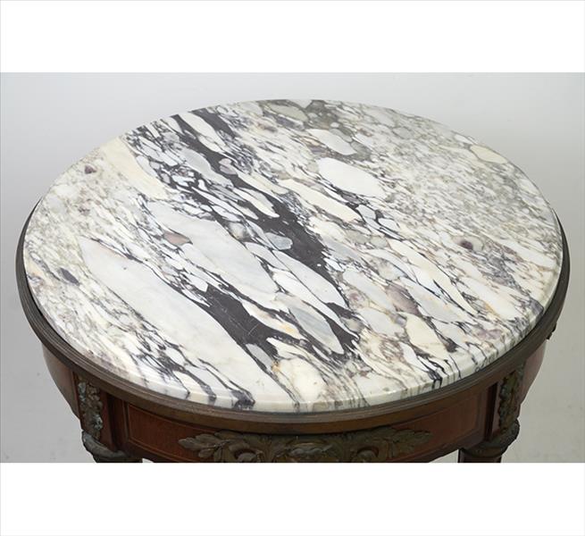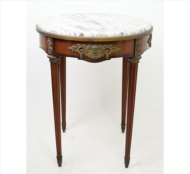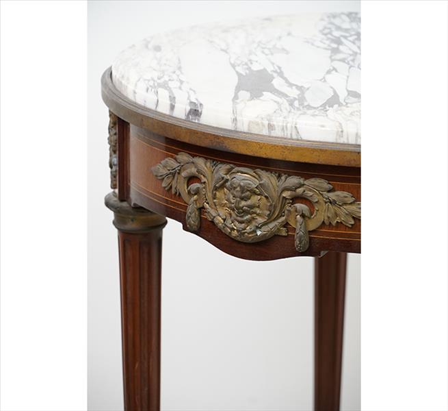 Mesa lateral de madeira, pernas cilíndricas com caneluras, decorada com guarnições e detalhes de bronze, tampo circular de mármore branco. Alt. 76 x 60cm. Europa, séc. XIX/XX