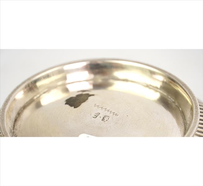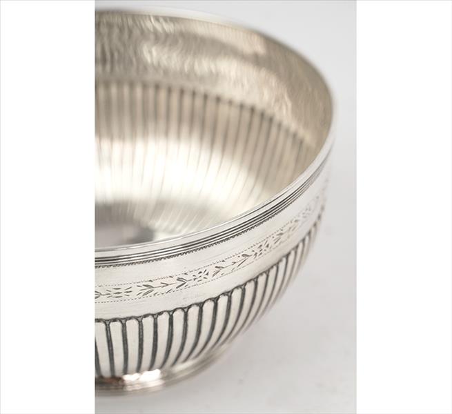 Bowl de prata-de-lei, contraste P Coroa, marca do prateiro ilegível, ornamentado com caneluras, bocal com ramagens estilizadas. Alt. 08 x 14cm. Portugal, início séc. XX