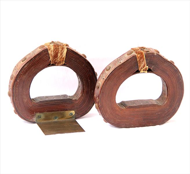 Par de estribos com estrutura de madeira, ornamentados com tarrachas e parte de couro animal, com suportes que podem ser usados como serra-livros. Alt. 16x12x09cm cada. Brasil, início séc. XX