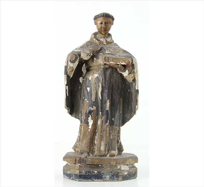 SANTO ANTÔNIO, Imagem de madeira entalhada, policromada e dourada, com olhos de vidro. Alt. 24 x 10 x 05cm. Brasil, séc. XIX