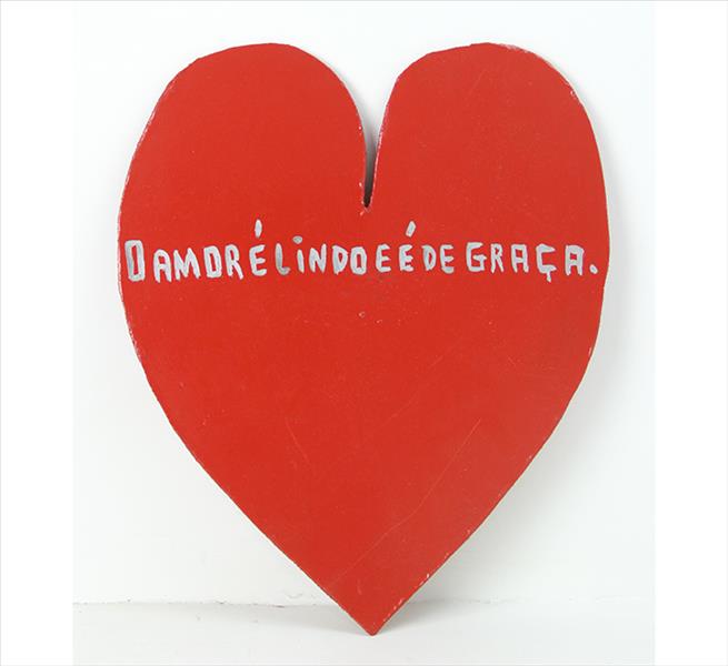 GETÚLIO DAMADO, O Amor é Lindo e é de Graça, placa de metal e resina policromada, assinado; estilo Arte Popular. 37 x 30cm. Localizado Bozolândia