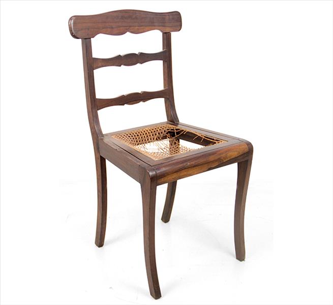 Cadeira de madeira jacarandá, espaldar recortado, pernas ligeiramente recurvas, assento de palhinha natural. Alt. 89 x 45 x 47cm. Brasil, início séc. XX (precisa refazer palhinha)