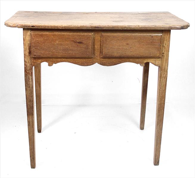 Mesa lateral rústica de madeira nobre, pernas retas, tampo retangular com cantos chanfrados, falsa gaveta na parte frontal. Alt. 81 x 94 x 48cm. Brasil, séc. XIX/XX