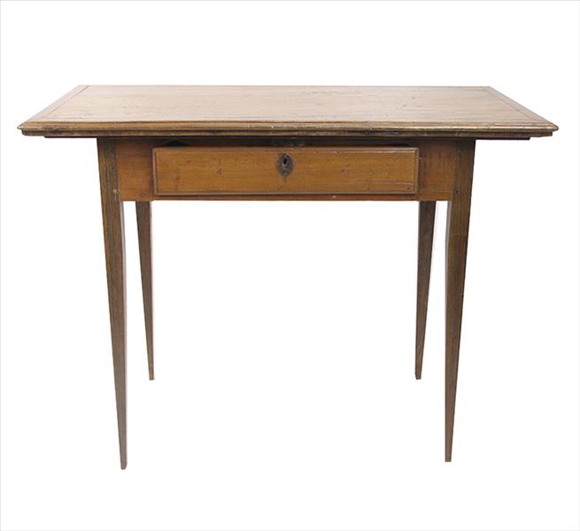 Mesa lateral de madeiras jacarandá e vinhático, estilo D. Maria I, pernas retas e tampo retangular, contém uma gaveta frontal. Alt. 84 x 108 x 54cm. Brasil, séc. XIX