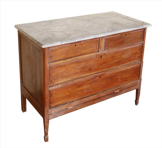 Cômoda de madeira nobre, possivelmente peroba, estrutura reta com pernas facetadas, contém duas gavetas com dois gavetões sotopostos, ornamentada com filetes marchetados, acompanha tampo de mármore. Alt. 82 x 103 x 52cm. Brasil, início séc. XX (precisa pequenos restauros / faltam puxadores)
