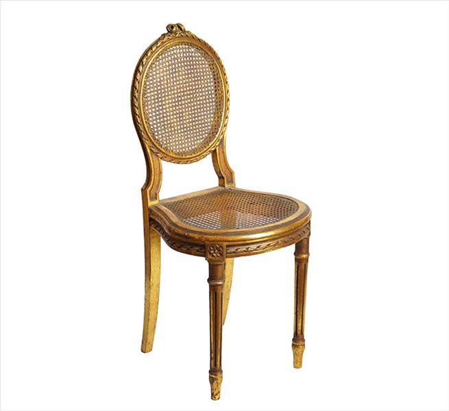 Cadeira de madeira entalhada e dourada, estilo Luís XVI, pernas caneladas, assento e espaldar de palhinha natural. Alt. 90 x 40 x 38cm. Início séc. XX