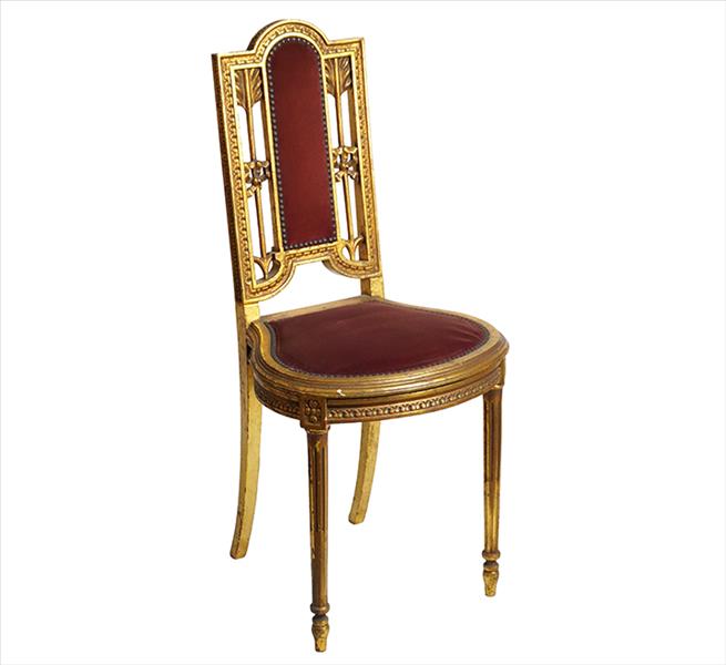 Cadeira de madeira entalhada e dourada, estilo Luis XVI, assento e espaldar com forração de veludo na tonalidade vinho, terminando em tarraxas. Alt. 90 x 42 x 38cm. Início séc. XX
