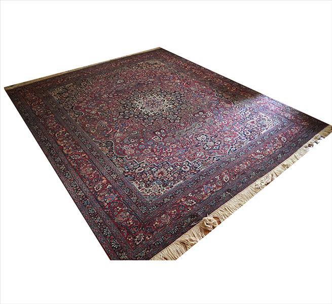 Tapete Tabriz, decoração com medalhão central floral, ramos e arabescos em composição espelhada simétrica, campo com tonalidades predominante bordô, borda tripla com flores estilizadas e guirlandas sobre fundo azul-marinho e vermelho, 392 x 340cm = 13,32m2 (com pontos rape)