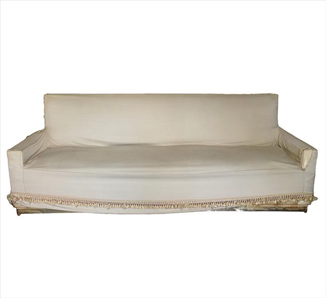 Sofá 04 lugares com estrutura de madeira, forração de tecido fino com cetin, base revestida de folha cromada, acompanha capa de tecido com franjas. Alt. 88 x 243 x 78cm. Brasil, década 60/70 (capa com rasgos)