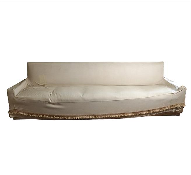 Sofá 05 lugares com estrutura de madeira, forração de tecido fino com cetin, base revestida de folha cromada, acompanha capa de tecido com franjas. Alt. 88 x 295 x 78cm. Brasil, década 60/70 (capa com rasgos)