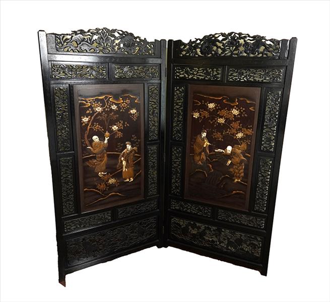 Biombo oriental de madeira nobre, estrutura de duas folhas, placas centrais ricamente ornamentadas com figuras em cenas mitológicas, aplicações de osso natural esculpido, madre-pérola e douração, guarnições finamente fenestradas com garças e guirlandas. Alt. 193 x 94cm (cada folha) e 193 x 198cm (total aberto). Japão, séc. XIX/XX (com restauro em um frontão superior e alguns lascados nas guarnições)