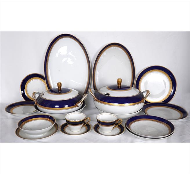 PORCELANA STEATITA, Remanescente de grande jogo de jantar de porcelana, contendo 66 pratos rasos, 84 sobremesa, 18 fundos, 28 pão, 02 travesas, 02 sopeiras, 01 molheira, 14 xícaras com 06 pires (sopeira maior com fio de cabelo / pode haver pequenos bicados)