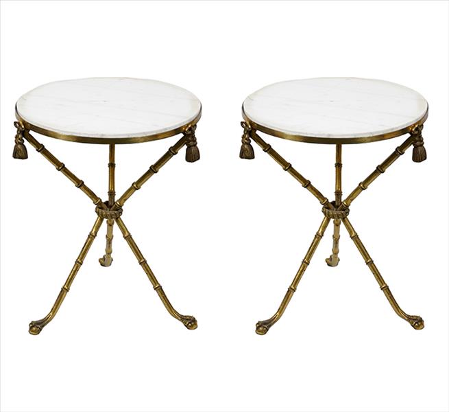 MAISON JANSEN (atribuído), Par de mesas laterais estilo império, estrutura de bronze simulando bambu, ornamentada com alças laterais representando franjas, pernas terminando em garras, tampo circular de mármore. Alt. 57 x 45cm cada.