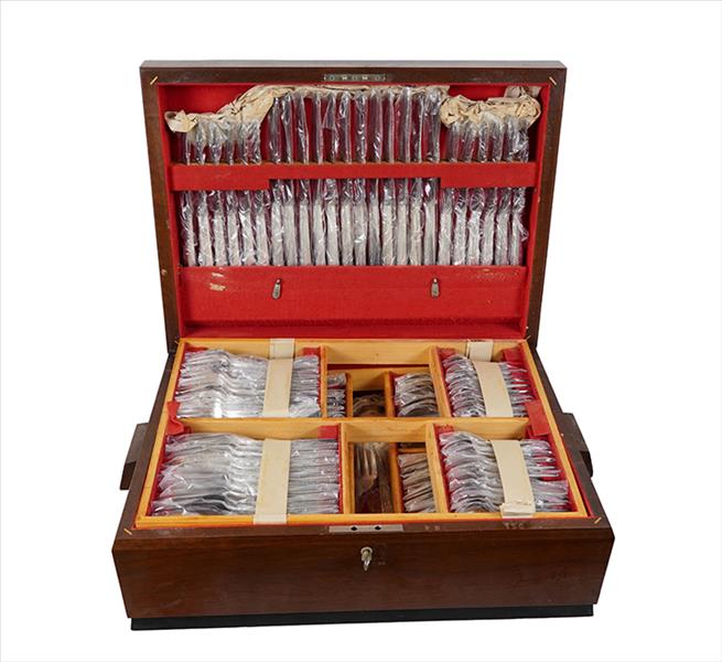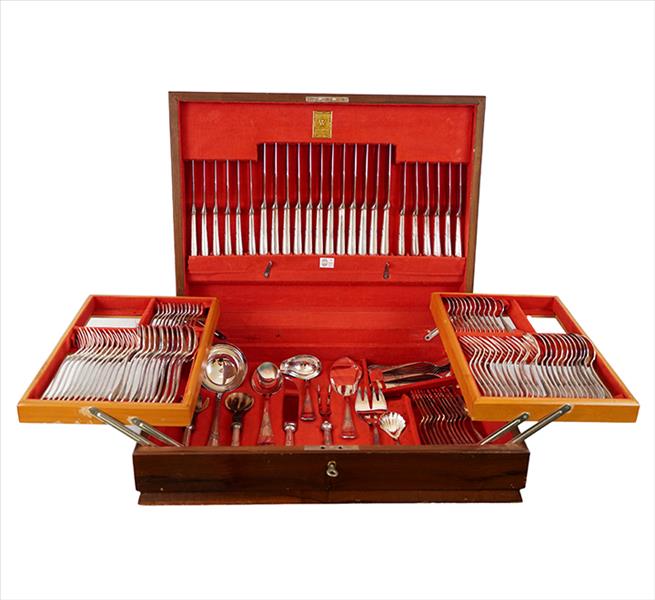 WOLFF, Faqueiro de metal espessurado à prata na caixa original, completo para 12 pessoas, contendo serviço de peixe, sendo 12 facas jantar, 12 garfos, 12 colheres, 12 f. sobremesa, 12g. bs., 12c. sb., 12 g. peixe, 12 g/ peixe e 10 peças de servir, total 106 peças. 14 x 54 x 40cm (caixa)