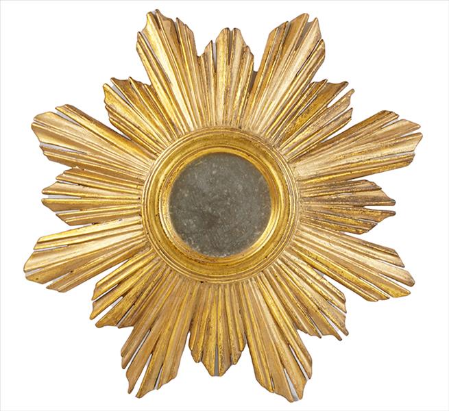 Espelho sol com moldura de madeira dourada e recortada. Diam. 31cm (total c/ moldura). Brasil, meados séc. XX