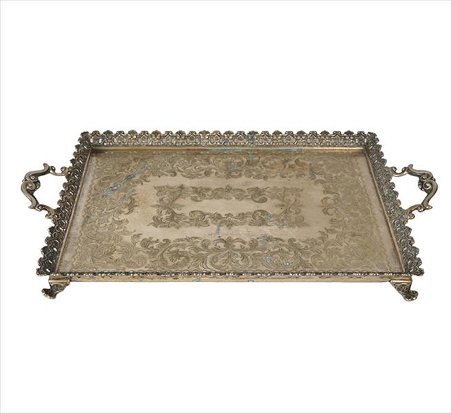 Travessa de prata-de-lei, contraste teor 833, ornamentada com guirlandas cinzeladas, galeria fenestrada. Alt. 08 x 41 x 24cm. Brasil, séc. XX