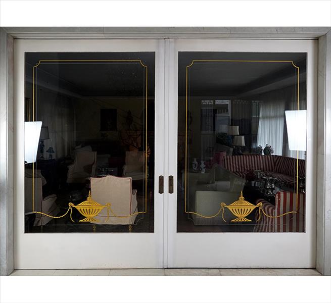 Portas de correr com estrutura de ferro patinado, decoradas com placas de vidro acidadas e detalhes dourados. Alt. 268 x 178cm (cada folha). Meados séc. XX (será necessário contratar serviço especializado para remoção das mesmas, por responsabilidade do arrematante)