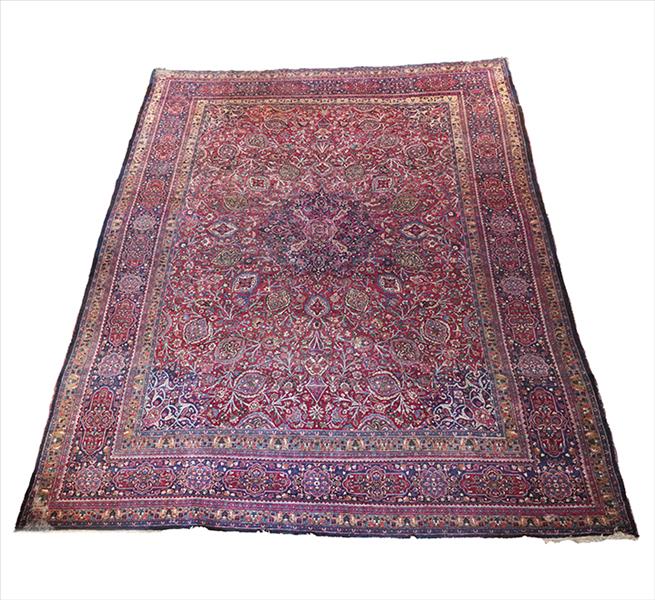 Tapete Kashan, decoração floral com medalhão central em arabescos e hastes entrelaçadas, campo com tonalidade predominante vermelho rubi, borda com composição de palmetas e ramos sinuosos, 378 x 310 cm = 11,72 m² (com pontos rape)