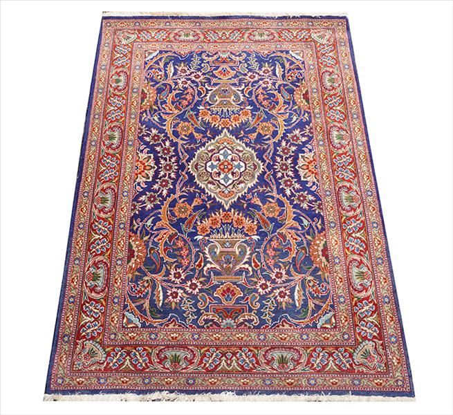 Tapete Isfahan, decoração floral clássica com arabescos e palmetas dispostos simetricamente em composição espelhada, medalhão central geométrico sobre campo azul profundo, borda tripla com faixa principal em vermelho ornada com cartuchos e flores em sequência contínua, 138 x 100 cm = 1,38 m² (precisa refazer franja)