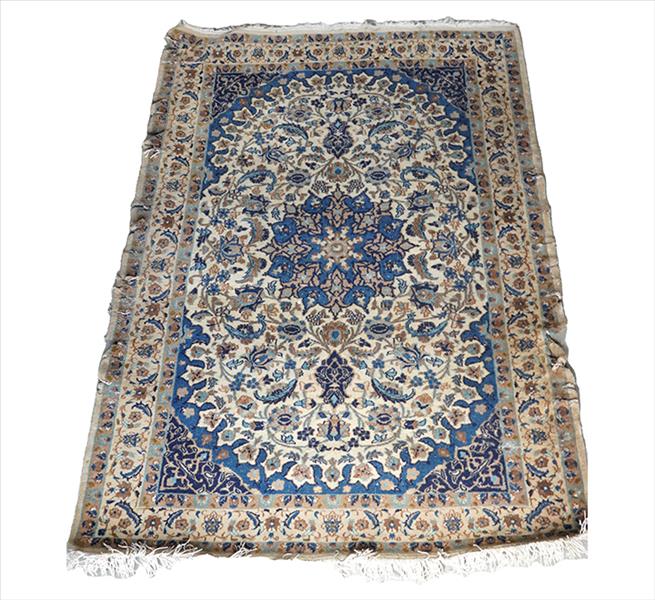 Tapete Naim, decoração com medalhão central ovalado rodeado por ramagens e flores simétricas, campo com tonalidade predominante bege claro, borda com múltiplas faixas florais em azul e bege sobre fundo cru, 193 x 127 cm = 2,45 m² (no estado / trama ressecada, com rasgos)