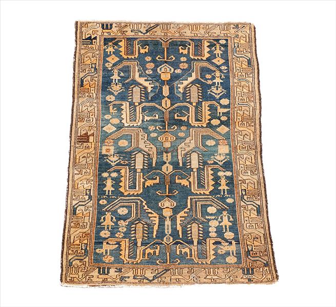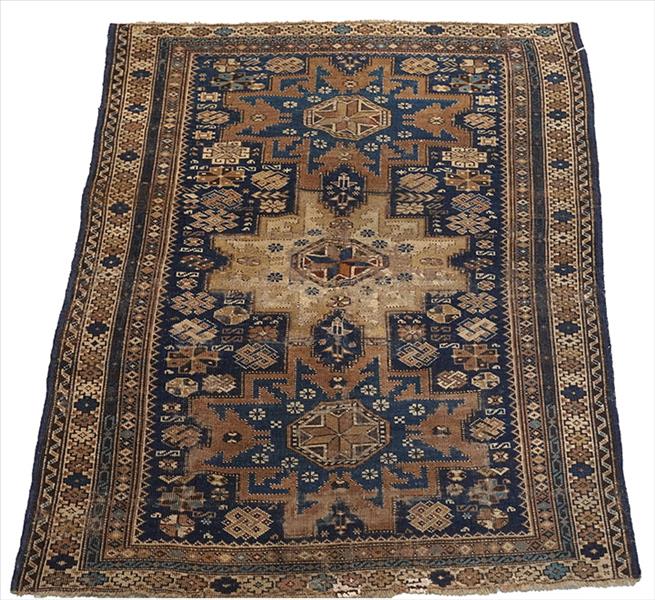 Tapete caucasiano Karabagh, decoração geométrica com variantes tardias do motivo dragão estilizado em disposição axial simétrica, apresentando elementos zoomórficos angulares, figuras humanas esquemáticas e ganchos recortados característicos da região de Karabagh; campo em tonalidade predominante azul-escuro, com motivos principais em bege, castanho e azul claro; borda tripla com faixa principal geométrica do tipo running dog reinterpretado, acompanhada de ornamentos angulares menores; 186 x 127 cm = 2,36 m²; circa 1900–1920. (desgaste de uso compatível com a idade)