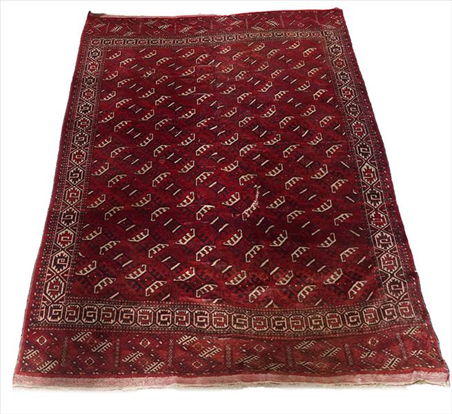 Tapete turcomano Tekke, Ásia Central, campo vermelho escuro com repetição de motivos gul octogonais alinhados, bordas com faixa principal geométrica e faixa elem inferior com losangos cruzados, composição tradicional de tribo Tekke em lã sobre lã, 317 x 225 cm = 7,13 m², início do século XX. (com desgaste no campo, furo visível e franjas ausentes)