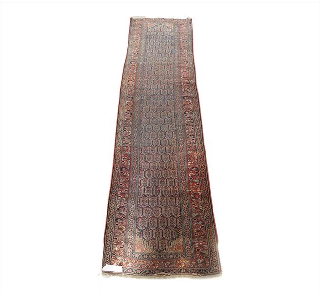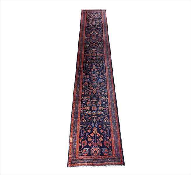 Tapete passadeira Malayer, Irã ocidental, campo azul escuro com padronagem herati em nichos ovais contínuos, bordas com faixa principal de flores estilizadas sobre fundo vermelho, composição densa e simétrica típica de ateliês urbanos do século XX, lã sobre algodão, 400 x 100 cm = 4,00 m², c. 1930. (com desgaste e necessidade de refazer franjas)