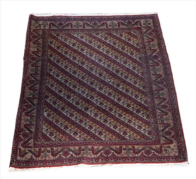 Tapete Qashqai tribal, decoração com desenho contínuo de campo em vermelho ferrugem preenchido por losangos interligados e motivos geométricos estilizados, acentuados por detalhes em creme, azul escuro e marrom, borda tripla com faixa principal vermelha ornada por pássaros estilizados e rosetas geométricas, 135 x 99 cm = 1,34 m², meados do século XX